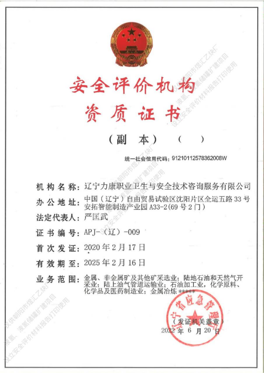 评价机构名称:辽宁力康职业卫生与安全技术咨询服务有