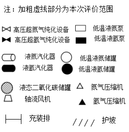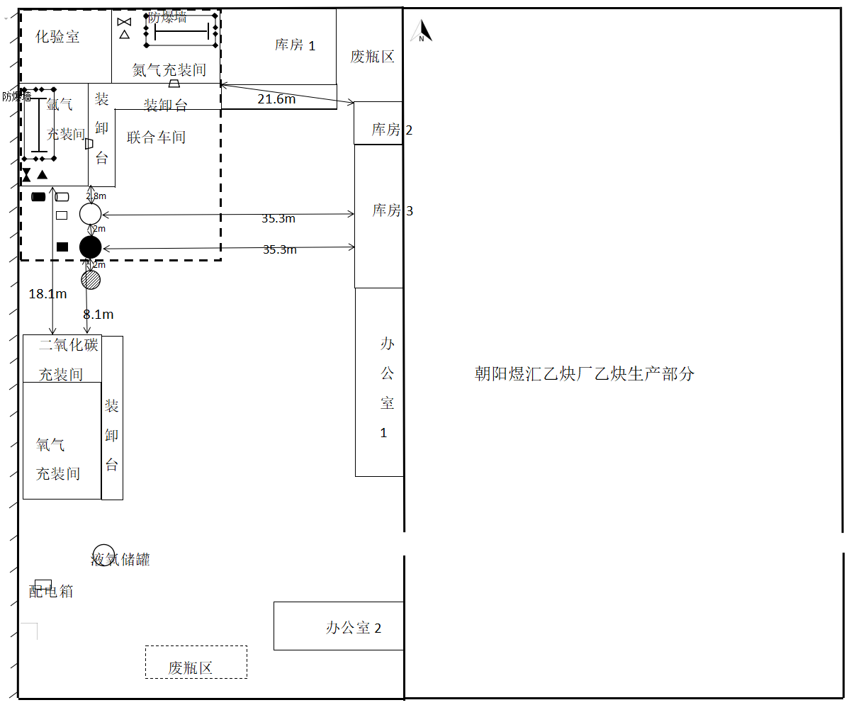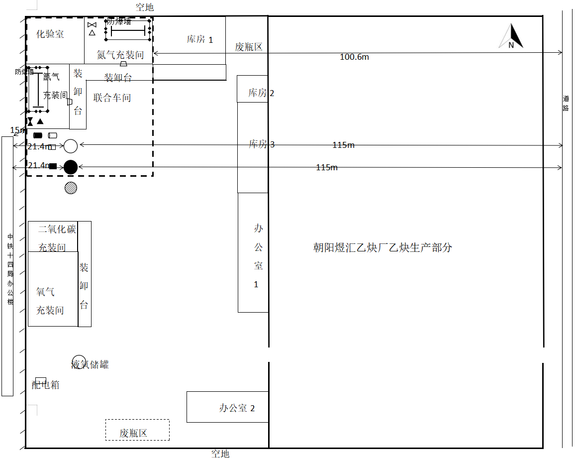 企业原有的库房1、库房2、库房3、办公室1、办公室2、二氧化碳充装间、氧气充装间、液氧储罐、液态二氧化碳储罐、废瓶区等均不在本次评价范围内。